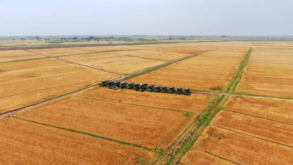 在金色麦浪涌动的示范创意园内,10多台联合收割机依次驶入作业区。种粮大户王义说:“今年我种了1016亩小麦,小麦长势良好,麦穗大,颗粒比较饱满,每亩产量预计超过1000斤。”