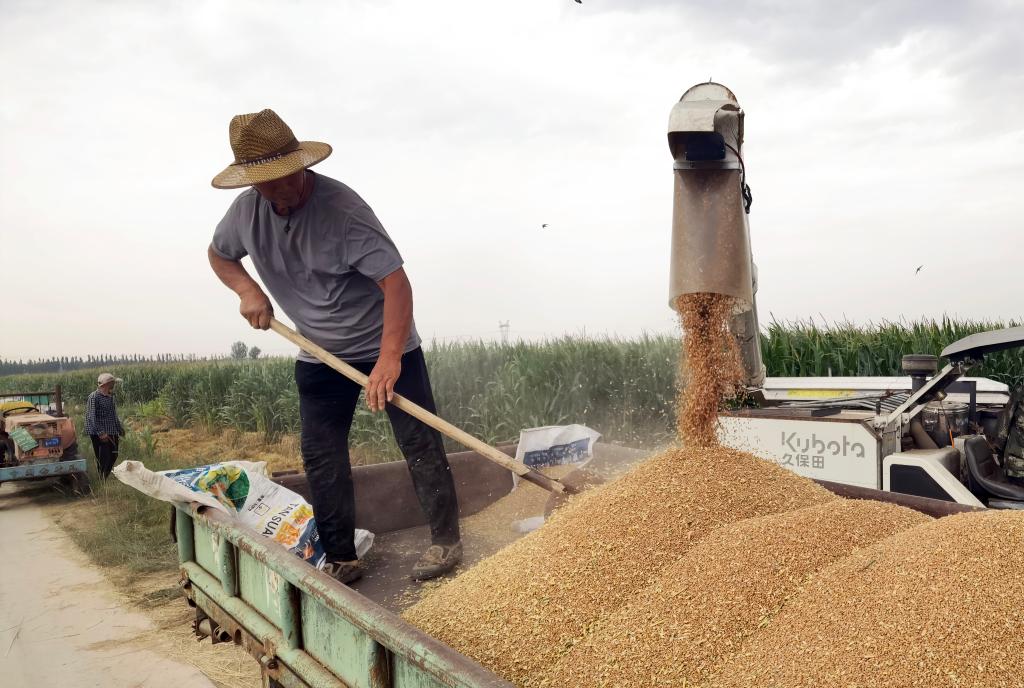临河区乌兰图克镇隆胜村村民正在收获小麦。新华社记者李云平 摄