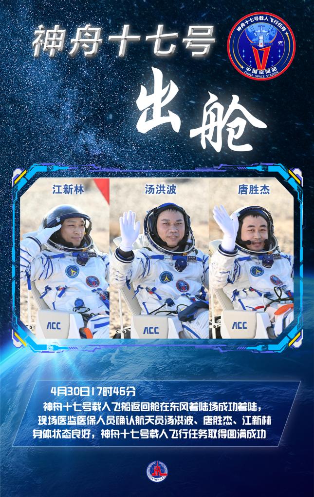4月30日18时37分,神舟十七号航天员汤洪波、唐胜杰、江新林全部安全顺利出舱,健康状态良好。至此,航天员汤洪波重返“天宫”的圆梦征程完美收官,航天员唐胜杰、江新林的首飞之旅圆满完成。汤洪波刷新中国航天员在轨飞行时间最长纪录。