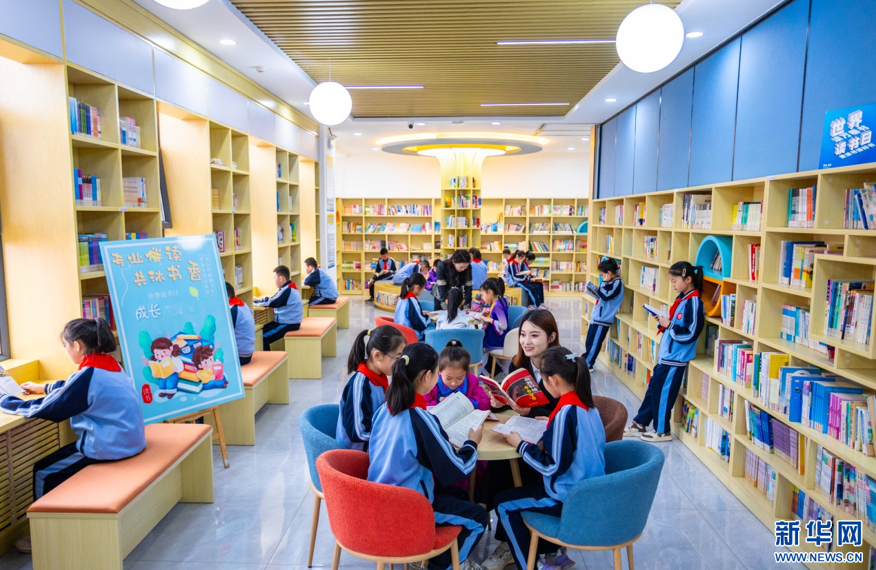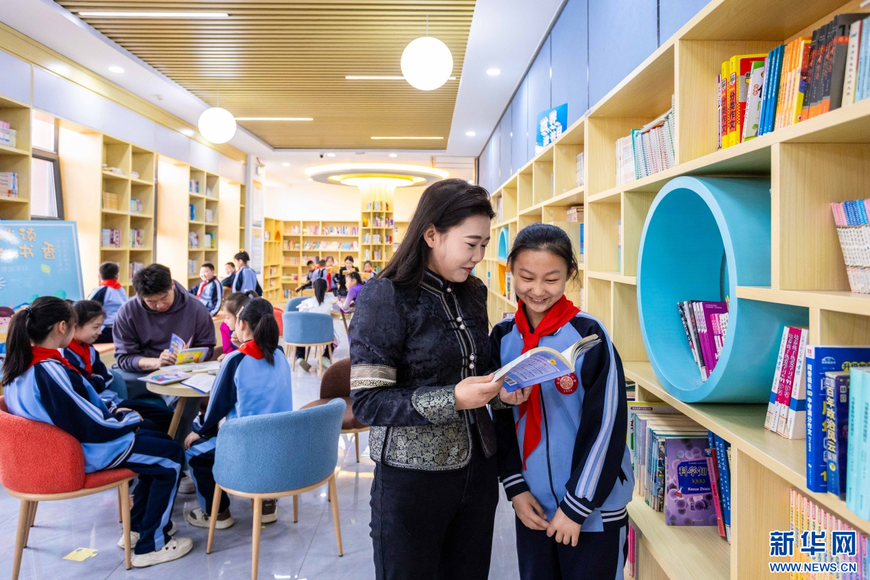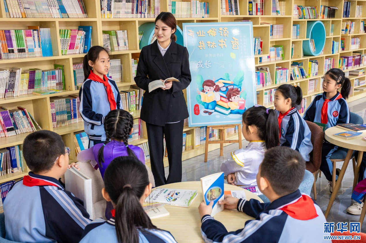 4月21日,呼和浩特市玉泉区南柴火市街小学青年教师在校园图书馆辅导学生们阅读。新华网发(丁根厚 摄)