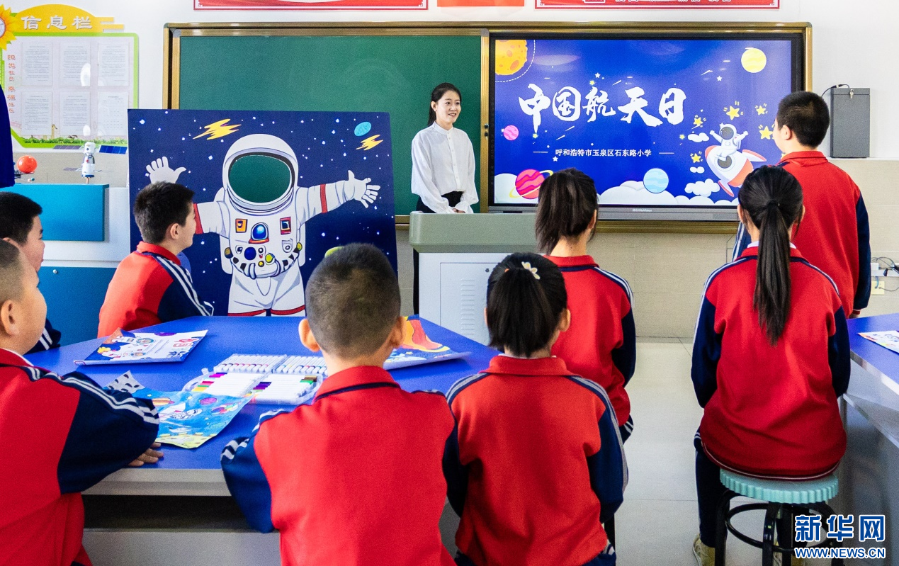 4月23日,呼和浩特市玉泉区石东路小学教师在为学生们讲解中国载人航天知识。新华网发(丁根厚 摄)