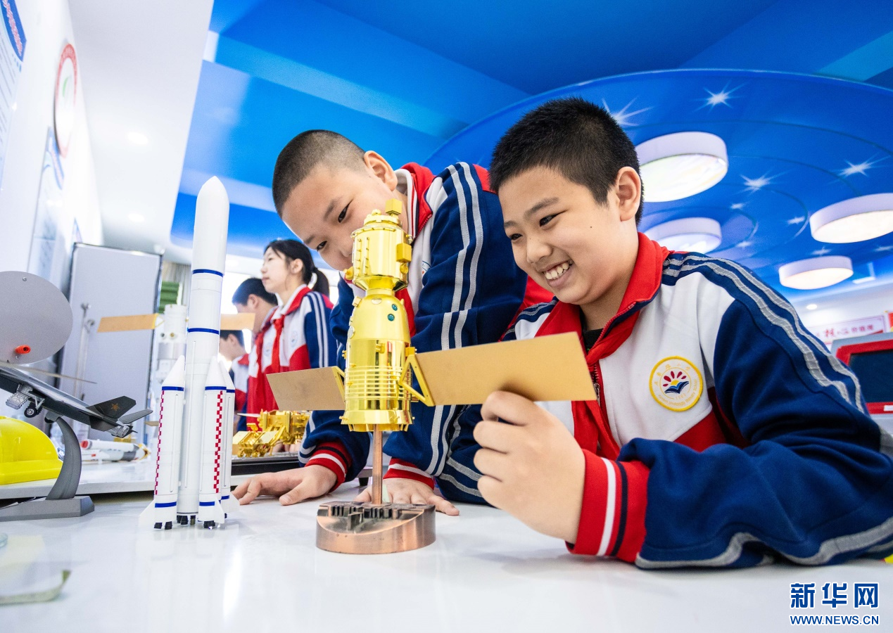 4月23日,呼和浩特市玉泉区石东路小学学生在中国航天日主题科普活动中近距离观看航天器模型。新华网发(丁根厚 摄)
