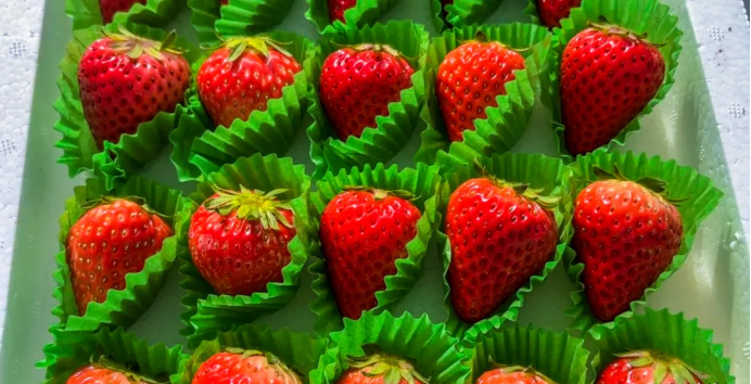 “沙漠红颜”草莓产自乌达区高标准果蔬种植基地,已建成42栋纯钢结构智能温室,配有200平方米分拣包装车间,采用立体化栽培模式,通过高效利用墙面空间,单栋温室年产草莓约1万斤左右,形成育苗、种植、流通全产业链条。