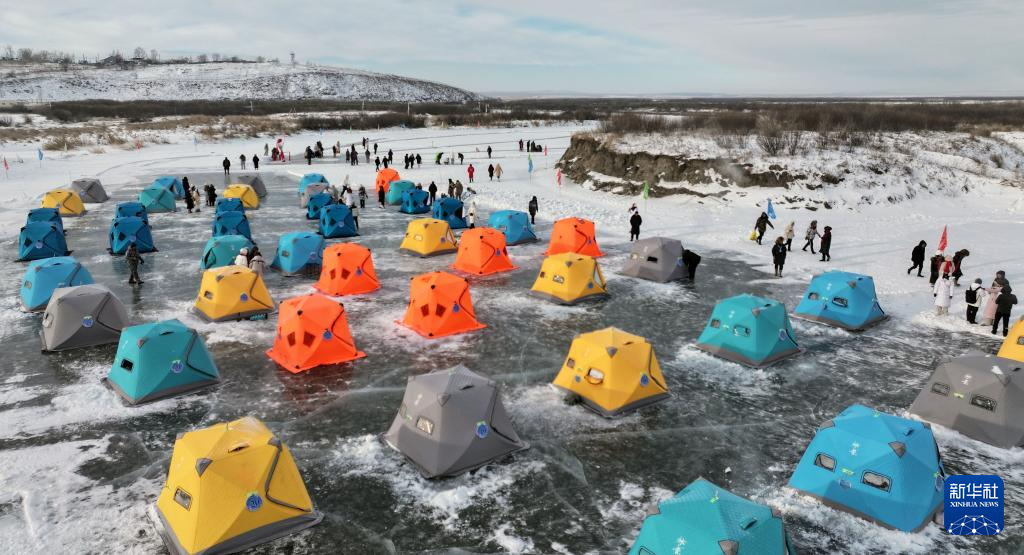 2024年12月22日,游客在内蒙古自治区额尔古纳市体验冰钓(无人机照片)。新华社发(韩颖群 摄)
