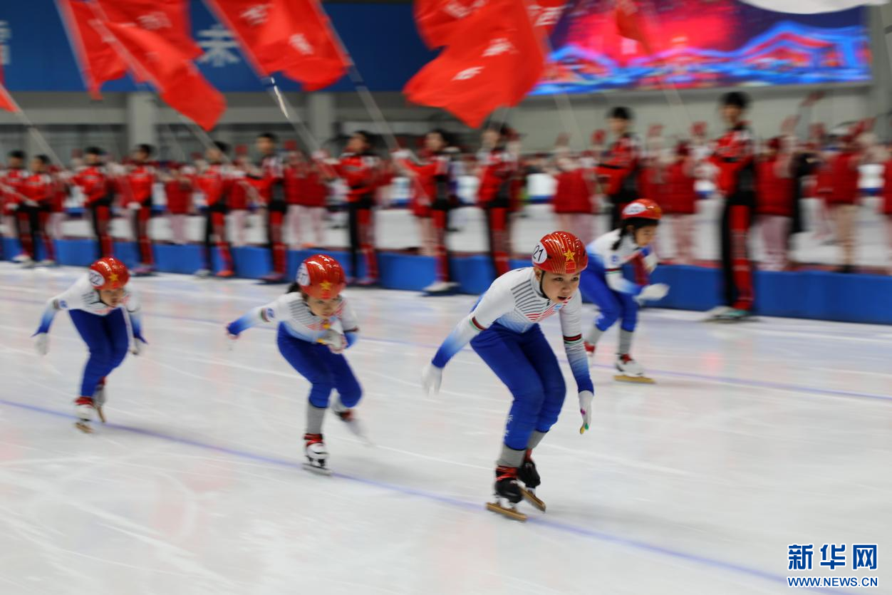 2024年12月21日,在第十一届全国大众冰雪季启动仪式活动现场,学生们进行速滑表演。新华网发 (韩颖群 摄)