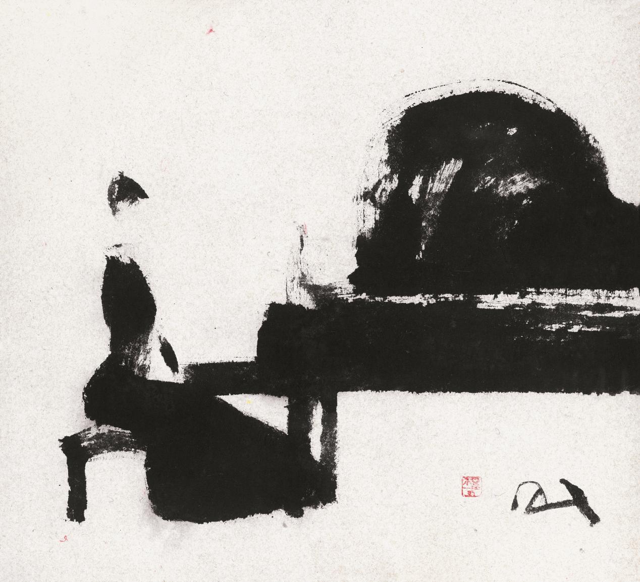 杨刚纸本水墨作品《长裙女骑手》作于2016年。