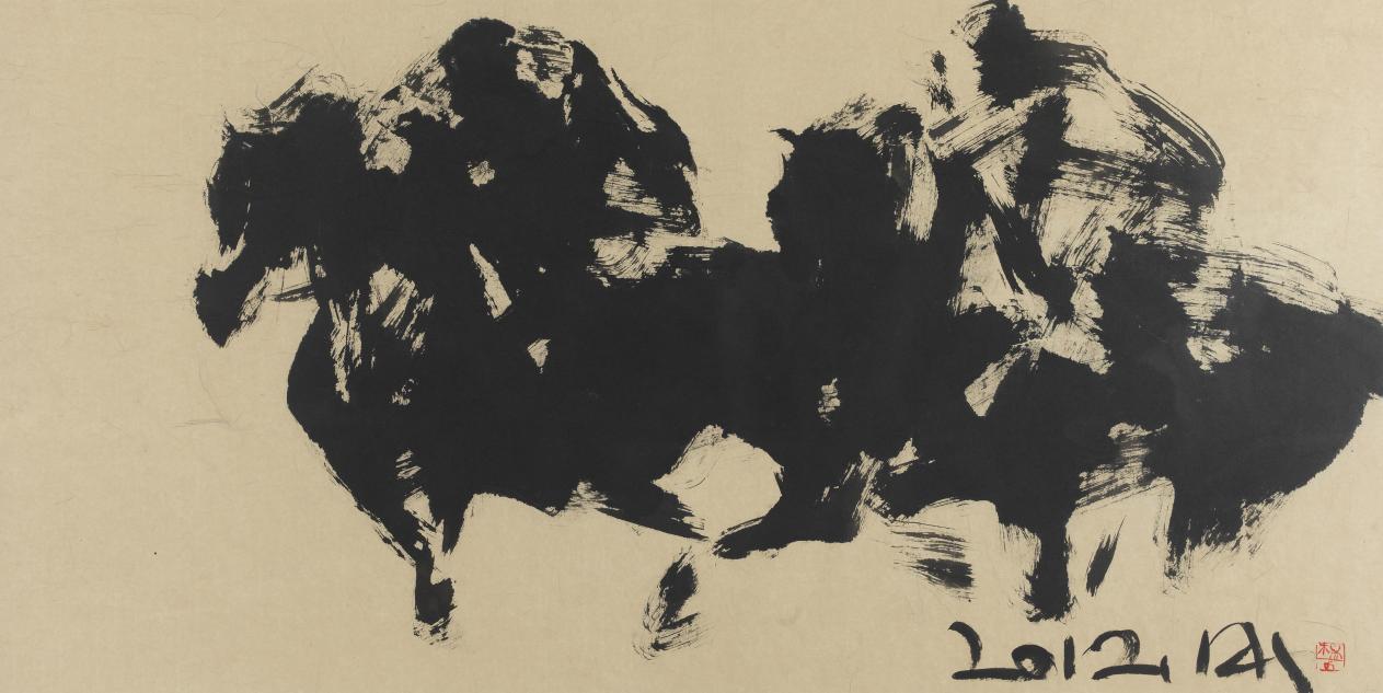 杨刚纸本水墨作品《并驾齐驱》,作于2012年。