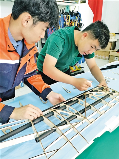 内蒙古工业大学智能装备研究院工作人员正在进行TS300长航时大载重固定翼无人运输机室内组装工作。