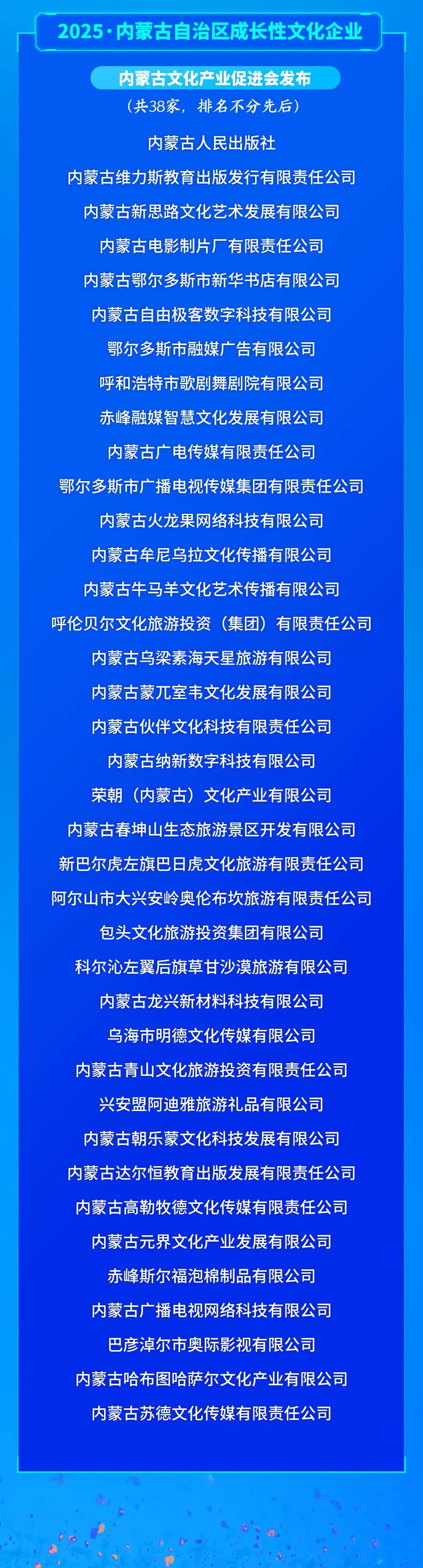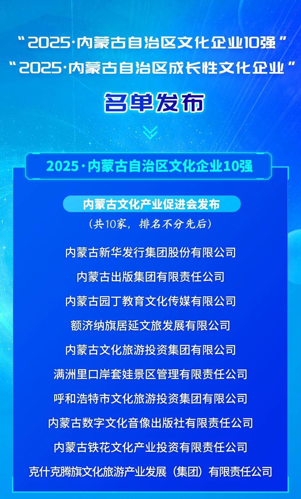此次评选由内蒙古文化产业促进会主办,经企业申报、盟市推荐、专家评审等程序严格遴选。入选企业涵盖出版发行、影视制作、文创设计等领域,集中展现内蒙古文化产业的骨干力量和发展活力。