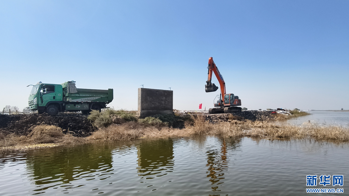 9月8日,工程车辆正在托县五申镇加固堤坝。新华网 杨腾格尔摄