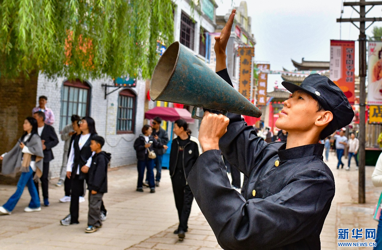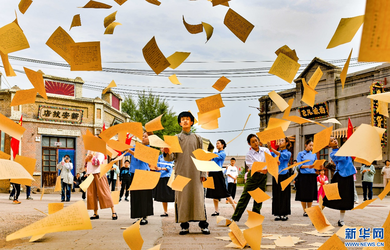 10月5日,演员在鄂尔多斯市伊金霍洛旗鄂尔多斯文化产业园影视拍摄基地沉浸式电影场景里表演。新华网发(王正 摄)