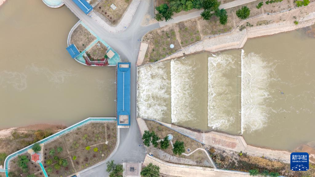 10月16日,用于灌溉的黄河水流经内蒙古巴彦淖尔市临河区境内的总干渠第二分水枢纽(无人机照片)。新华社记者 马金瑞 摄