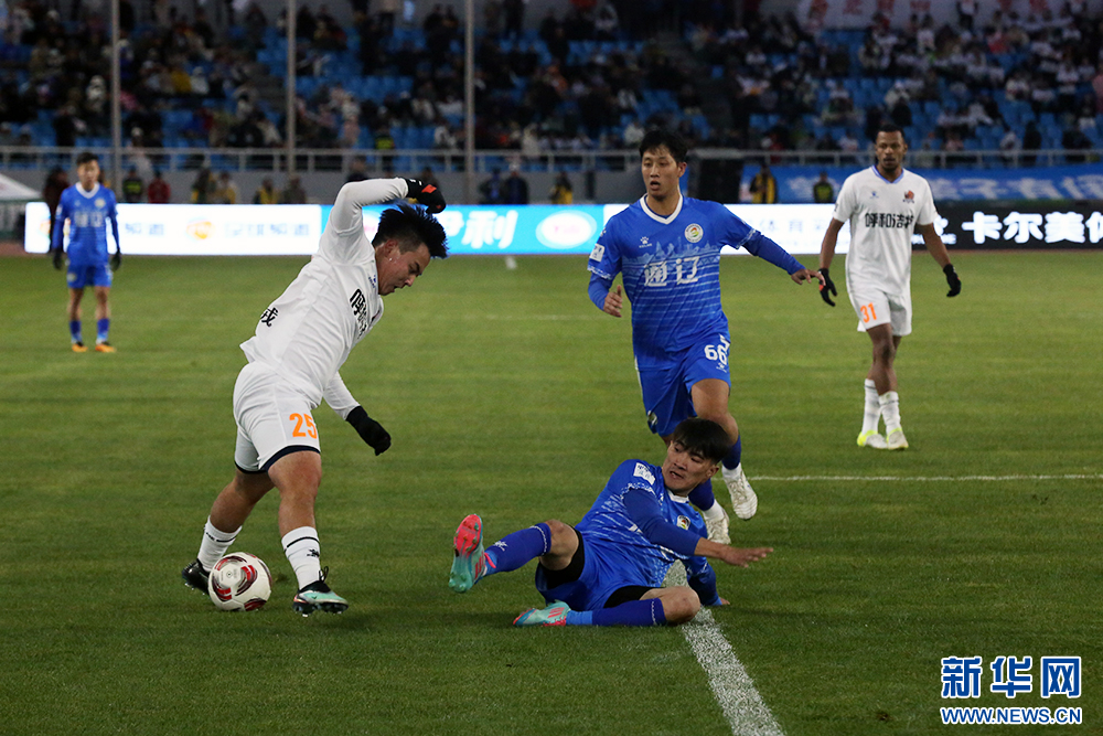 10月25日,呼和浩特队球员与通辽队球员在比赛中拼抢。新华网 石毅 摄