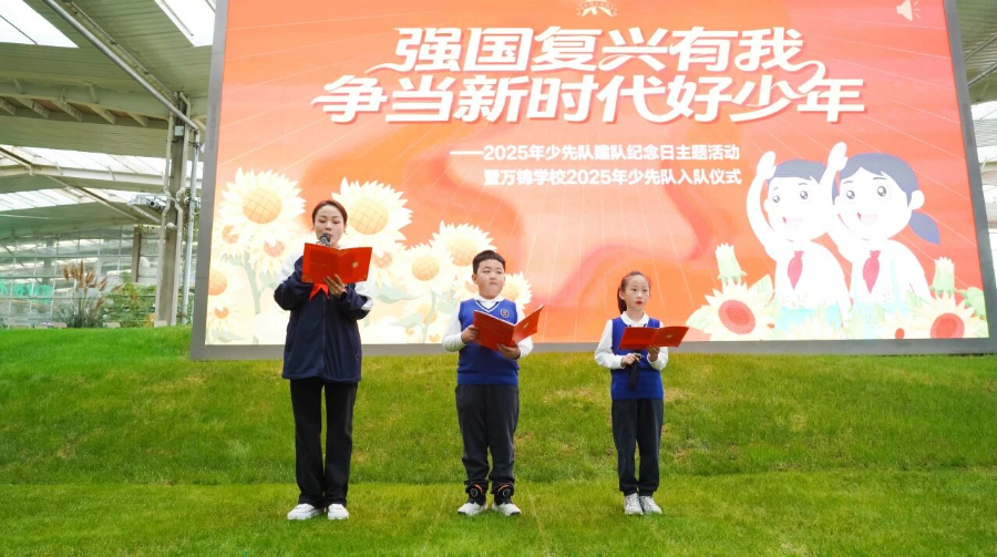 建队日当天,万锦学校在蒙草研学基地隆重举行2025年少先队入队仪式,一批崭新的面孔,在星星火炬旗帜下宣誓,光荣加入中国少年先锋队。