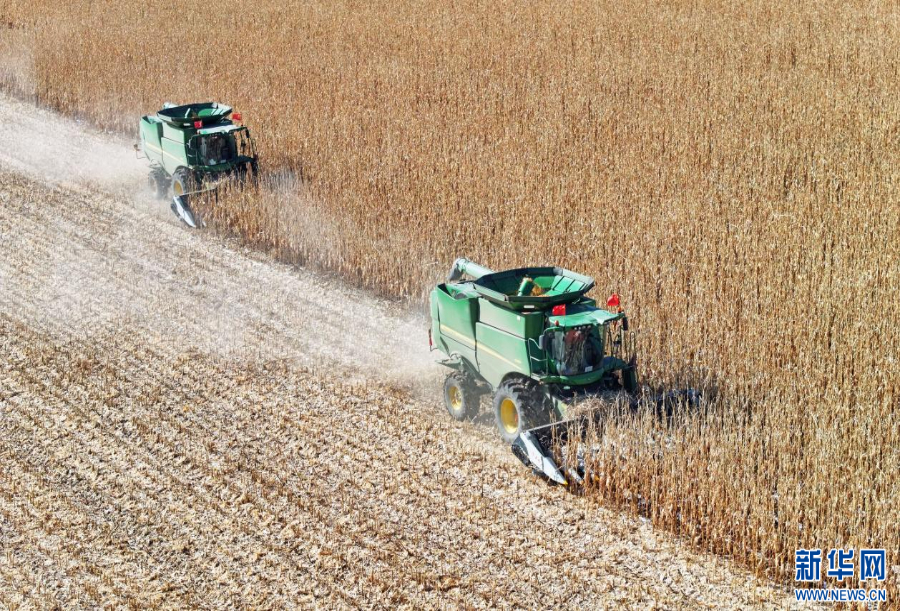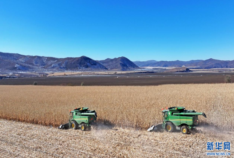 10月30日,内蒙古自治区呼伦贝尔农垦物资石油集团工作人员在绰尔河农牧场有限公司,统筹调度农业机械抢收玉米。新华网发(马阳晨 摄)