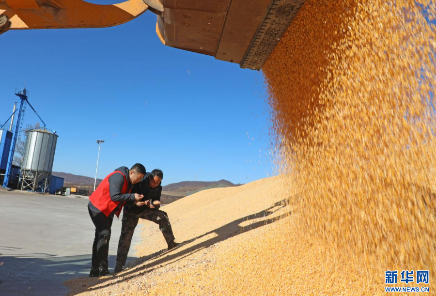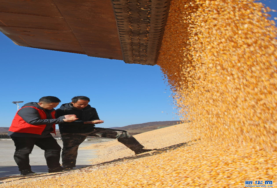 10月30日,内蒙古自治区呼伦贝尔农垦物资石油集团工作人员在绰尔河农牧场有限公司实地查看玉米收储进展。新华网发(韩颖群 摄)