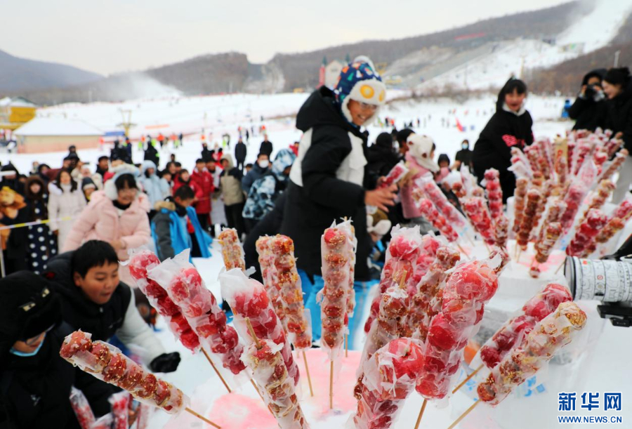 11月15日,在内蒙古自治区扎兰屯金龙山休闲度假旅游区,小朋友品尝冰糖葫芦。新华网发(韩颖群 摄)