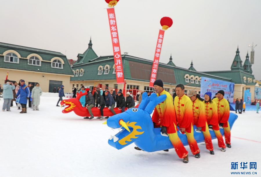 11月15日,游客在内蒙古自治区扎兰屯金龙山休闲度假旅游区进行雪地龙舟比赛。新华网发(韩颖群 摄)