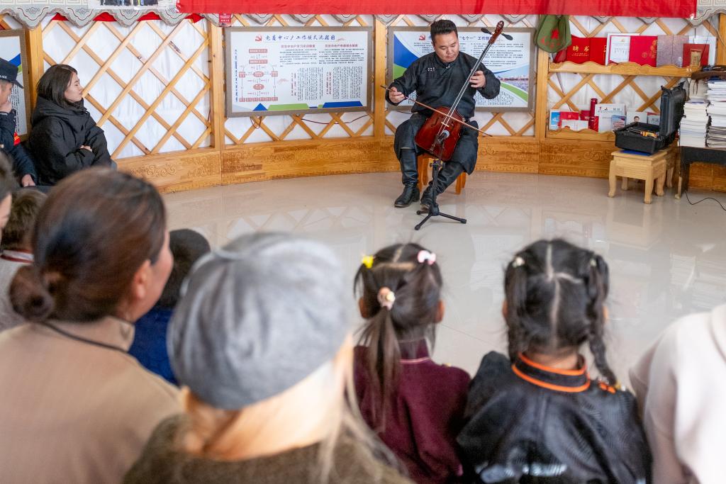 11月12日,在内蒙古锡林郭勒盟苏尼特右旗额仁淖尔苏木吉呼郎图嘎查赛音巴特尔护边驿站,“小小乌兰牧骑”的演员们在“送欢乐、送文明”基层服务活动中表演。 乌云吉日嘎拉是苏尼特右旗乌兰牧骑的马头琴演员兼呼麦歌手。一专多能的他,13年来随队走遍了全旗7个苏木和58个嘎查,仍在坚守着“不落下一个蒙古包”的初心。