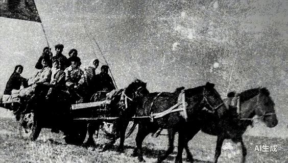 20世纪50年代,苏尼特右旗乌兰牧骑的演员们乘马车下乡演出。(AI复原动图)