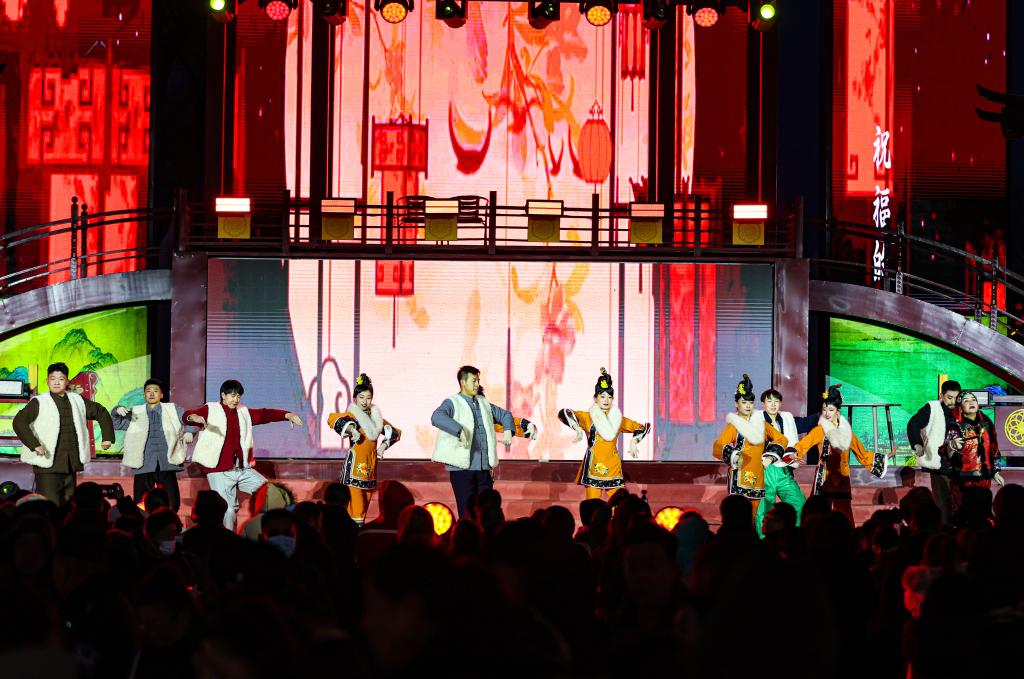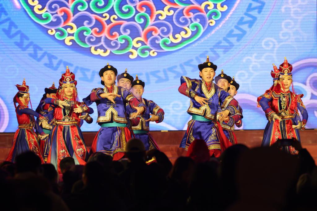 2025年12月31日,演员在美稷·长河里夜未央不夜城表演蒙古族舞蹈。(康文魁 摄)