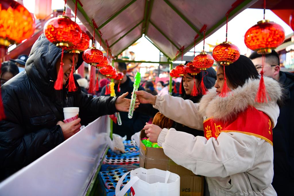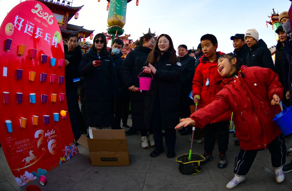 2025年12月31日,市民游客在美稷·长河里夜未央不夜城参与投壶有奖游戏。(康文魁 摄)