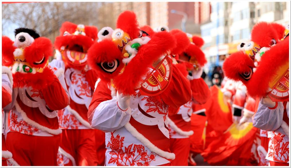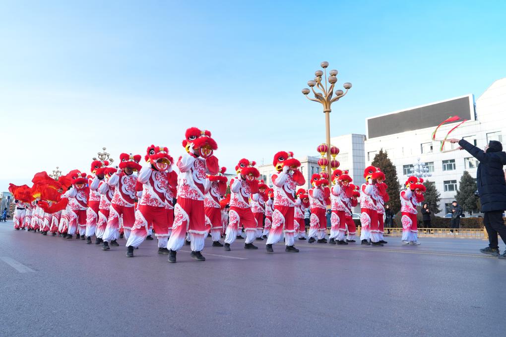 2025年12月31日,巡游队伍在准格尔广场表演舞狮。(曹文进_摄)