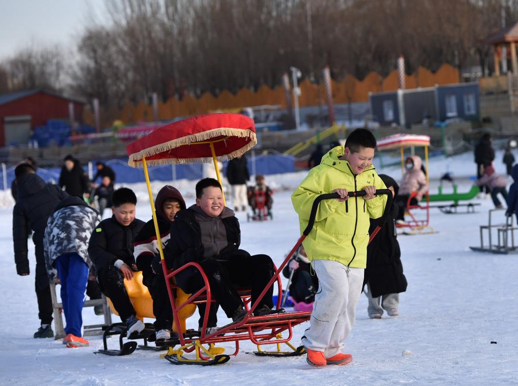 12月31日,市民游客在美稷·长河里夜未央不夜城冰雪主题乐园乘雪车玩耍。(吴潇莹 摄)