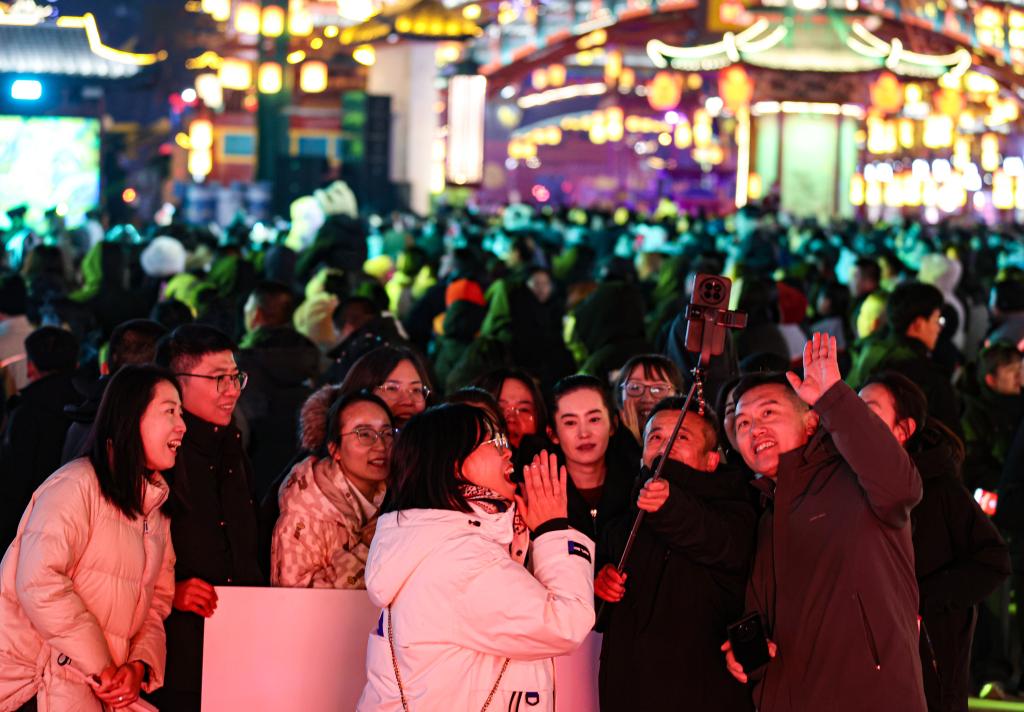 2025年12月31日,市民游客在美稷·长河里夜未央不夜城观看文艺演出。(康文魁 摄)
