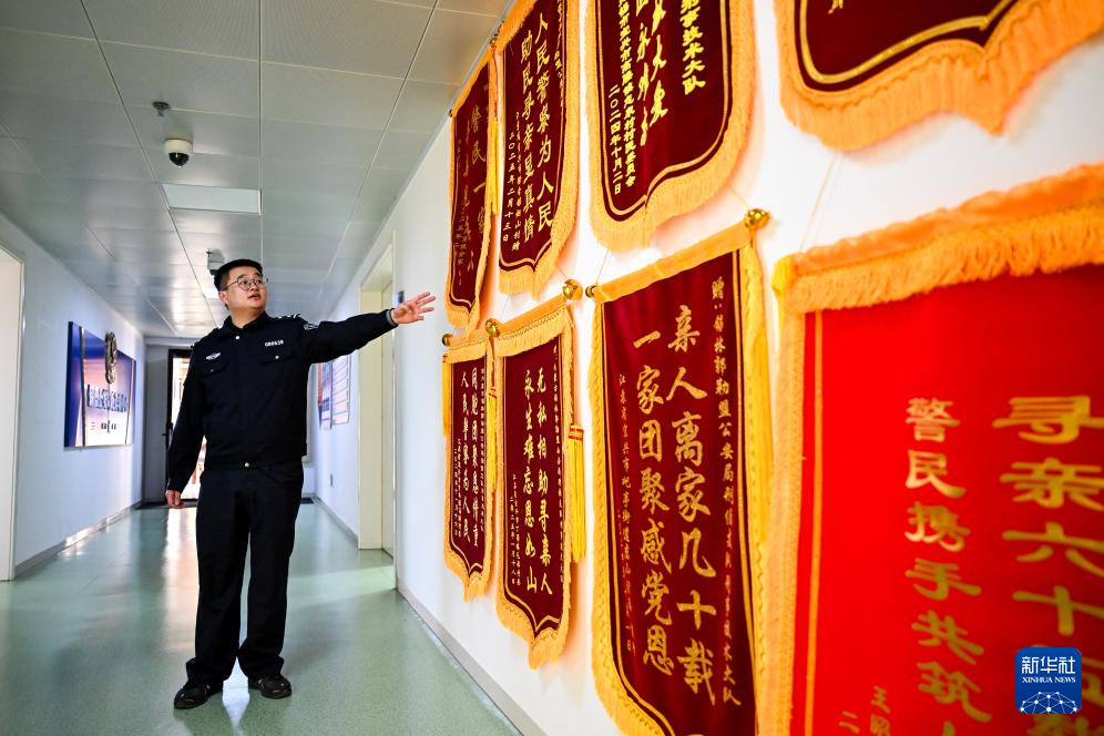 1月7日,锡林郭勒盟公安局刑侦支队刑事技术大队的许锐佳在锡林郭勒盟公安局介绍寻亲成功的“国家的孩子”赠送的锦旗。新华社记者 李志鹏 摄