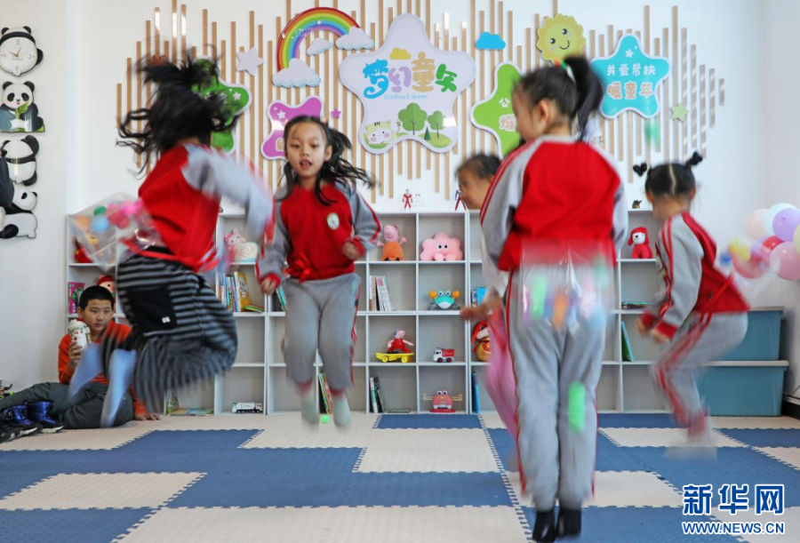 1月9日,在内蒙古自治区扎兰屯市繁荣办事处新风社区阳光农场,小朋友们进行抖球趣味游戏。新华网发(韩颖群 摄)