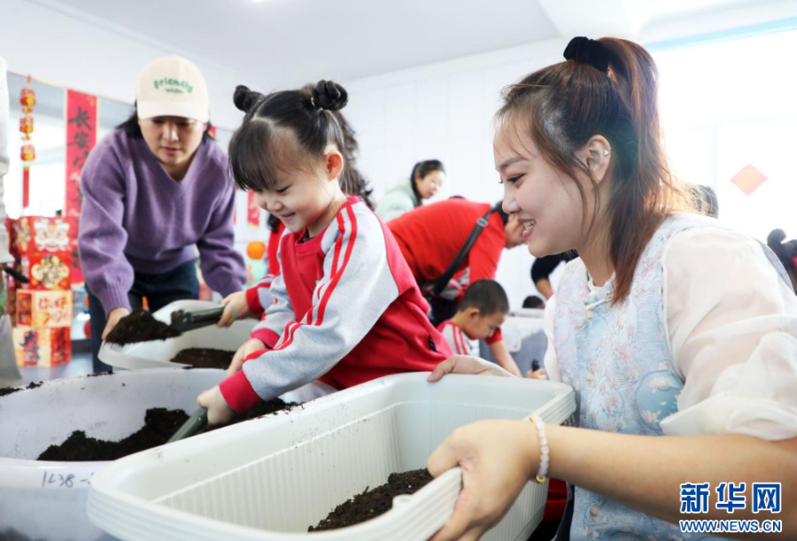 1月9日,在内蒙古自治区扎兰屯市繁荣办事处新风社区阳光农场,小朋友挖土种植蔬菜。新华网发(韩颖群 摄)