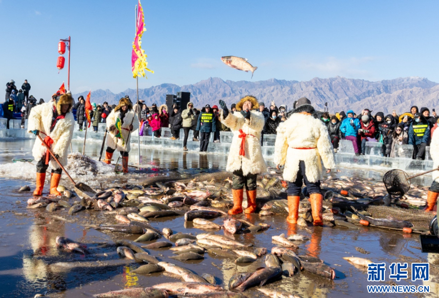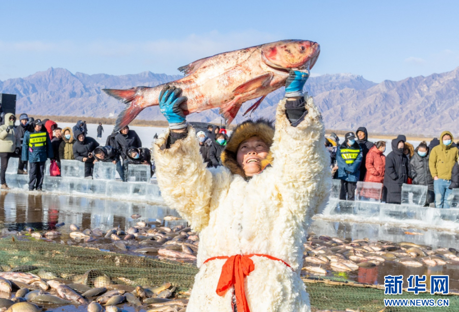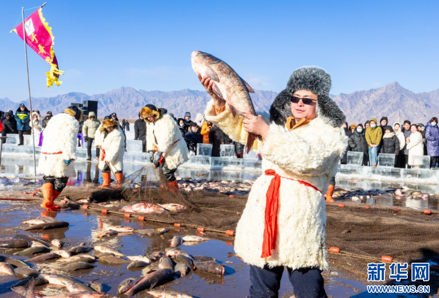 1月10日,鱼把头在哈素海第四届冬捕节现场捧鱼送祝福。新华网发(丁根厚 摄)