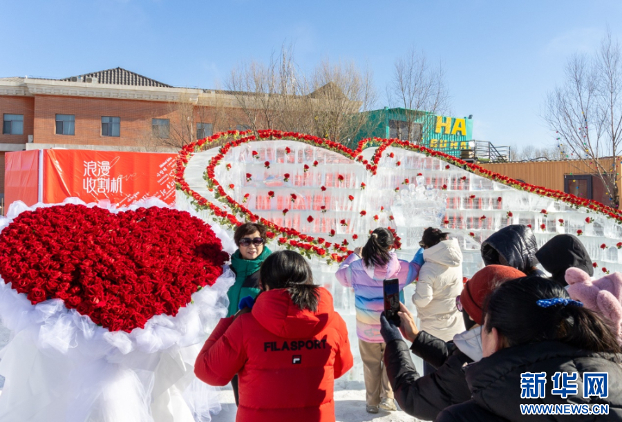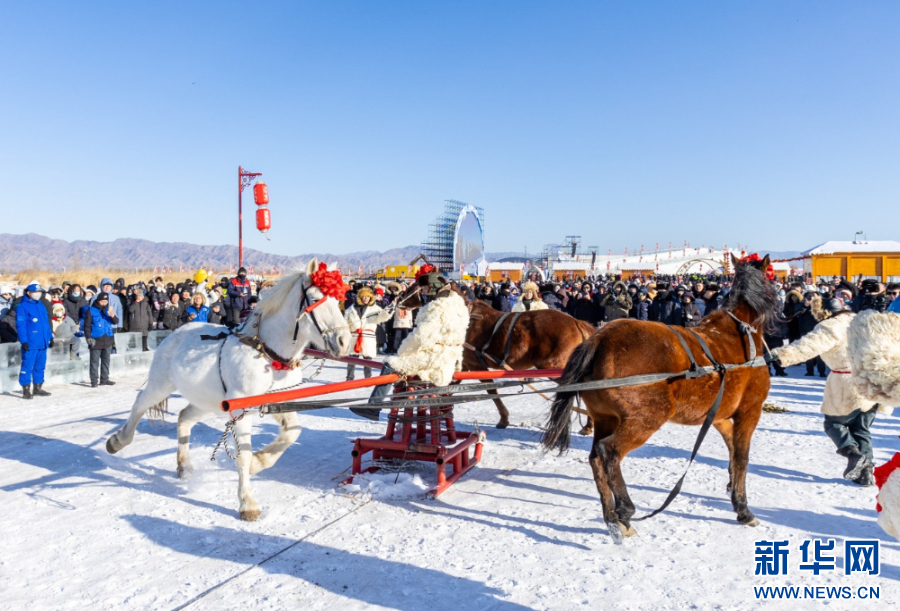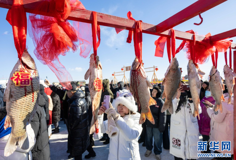 1月10日,市民、游客在哈素海第四届冬捕节现场拍照打卡。新华网发(丁根厚 摄)