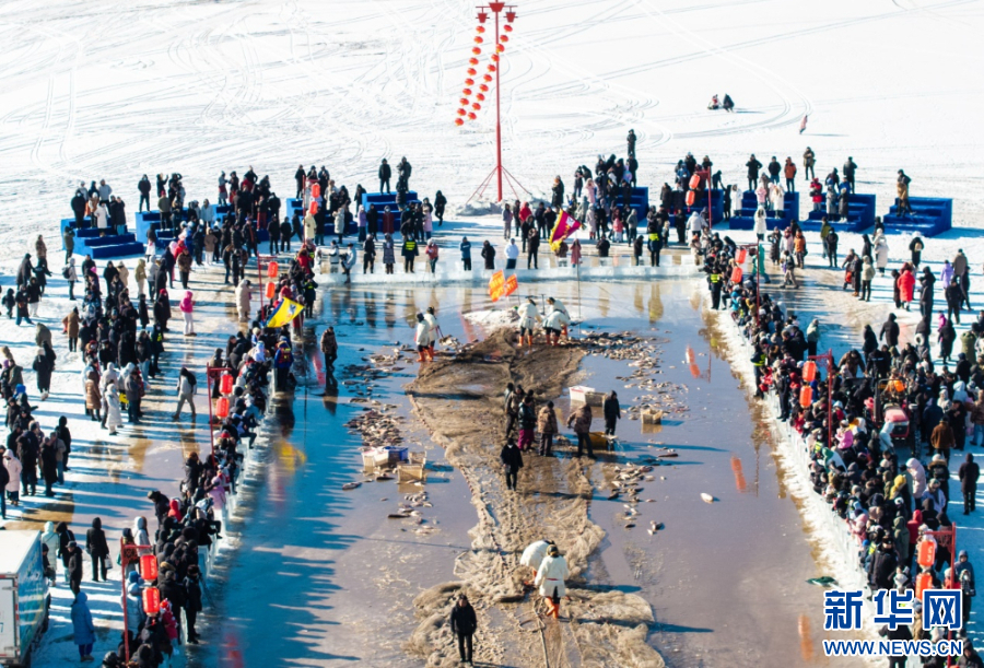 1月10日,市民、游客在哈素海第四届冬捕节现场观看冬捕。新华网发(丁根厚 摄)
