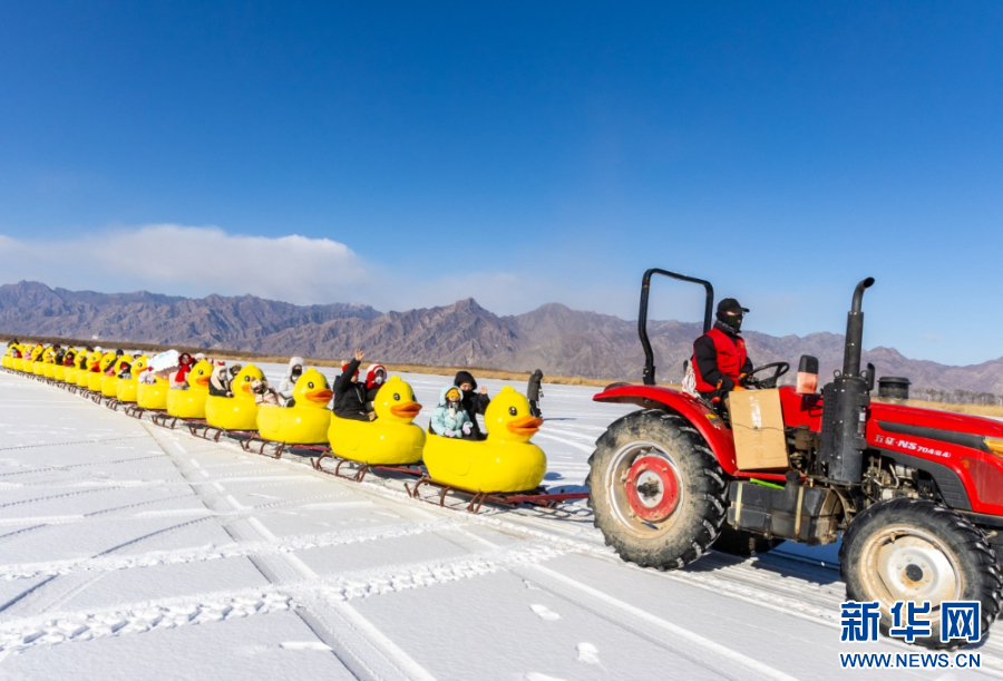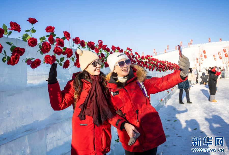 1月10日,游客在哈素海第四届冬捕节现场拍照打卡。新华网发(丁根厚 摄)