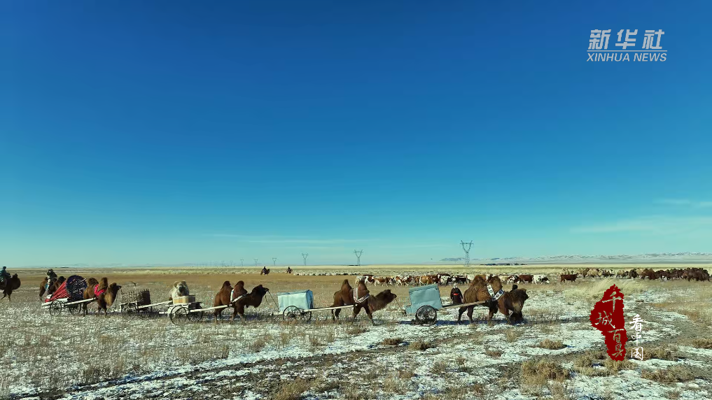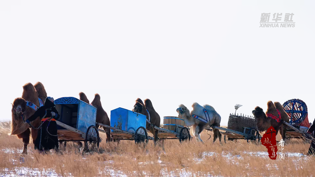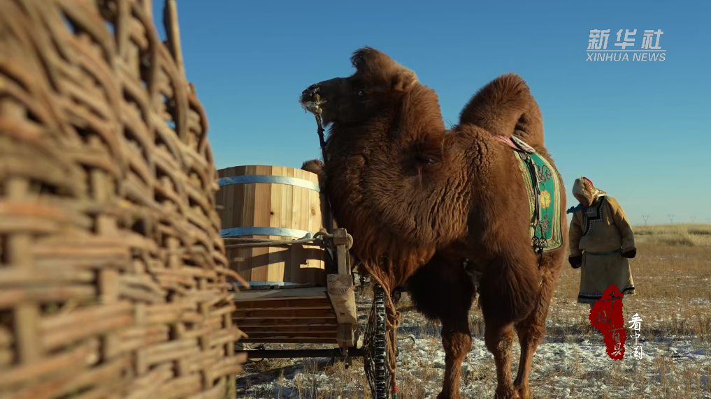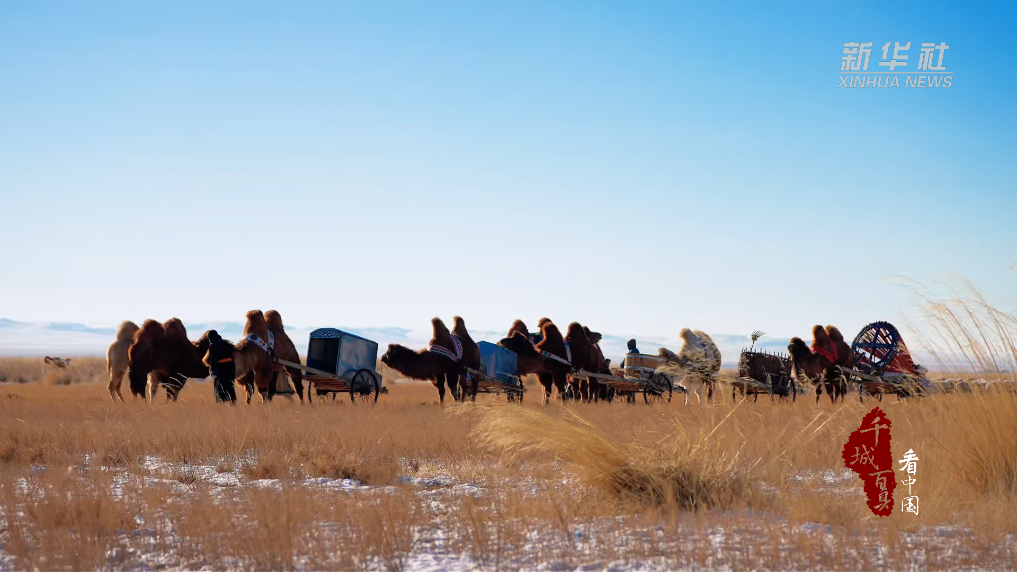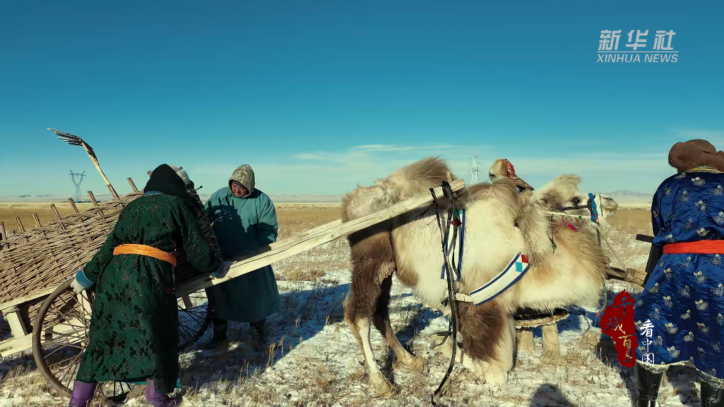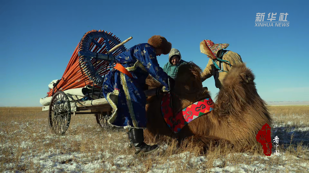 在零下20℃的寒风中,一家人分工协作,圈骆驼、戴笼头、套车、装物资、系绳索、出发……车队缓缓穿行草场,蹄印在薄雪上拓出深浅不一的纹路,蒙古袍上的晨霜随动作簌簌掉落。