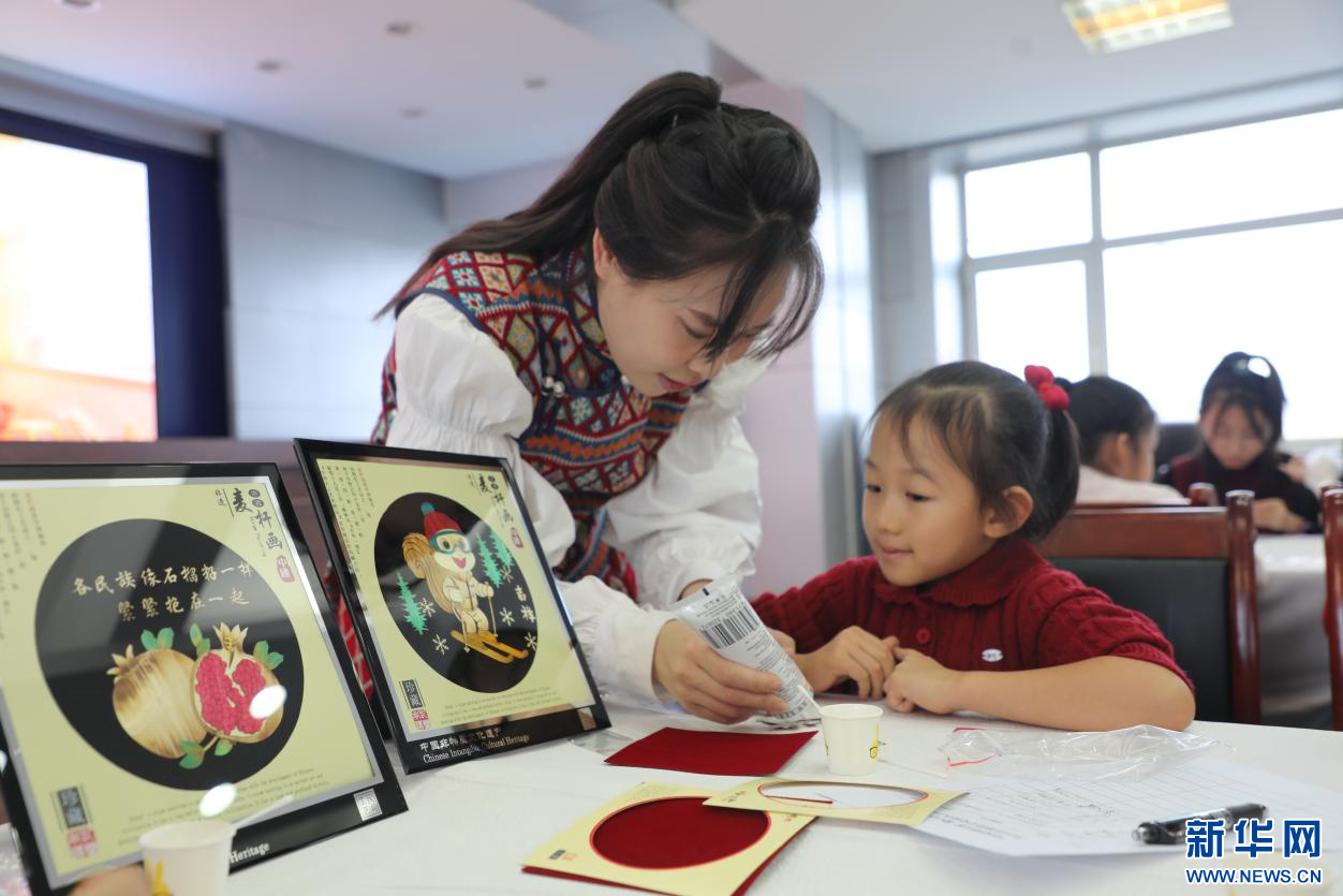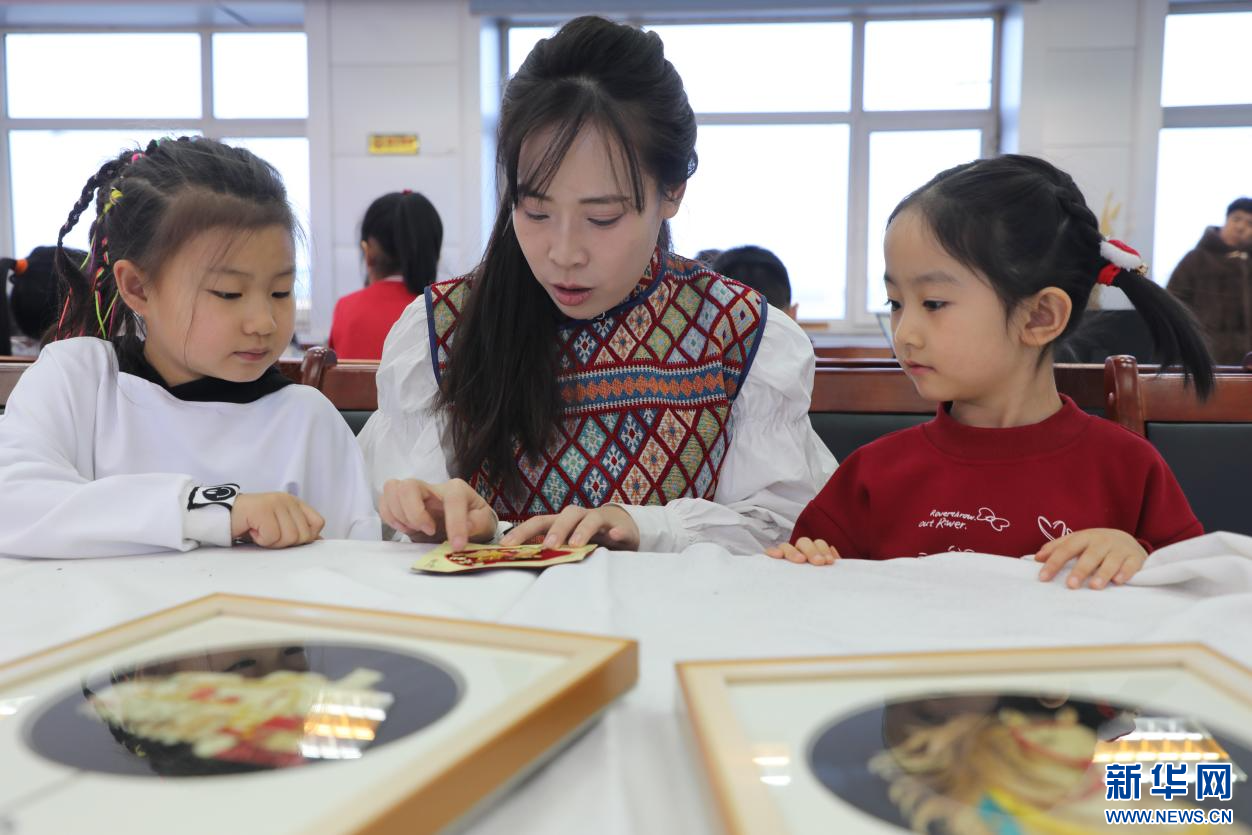 1月26日,在内蒙古自治区扎兰屯市正阳街道永安社区,小朋友在麦杆画非物质文化遗产代表性传承人李玲(中)的指导下制作麦秆画。新华网发 (韩颖群 摄)