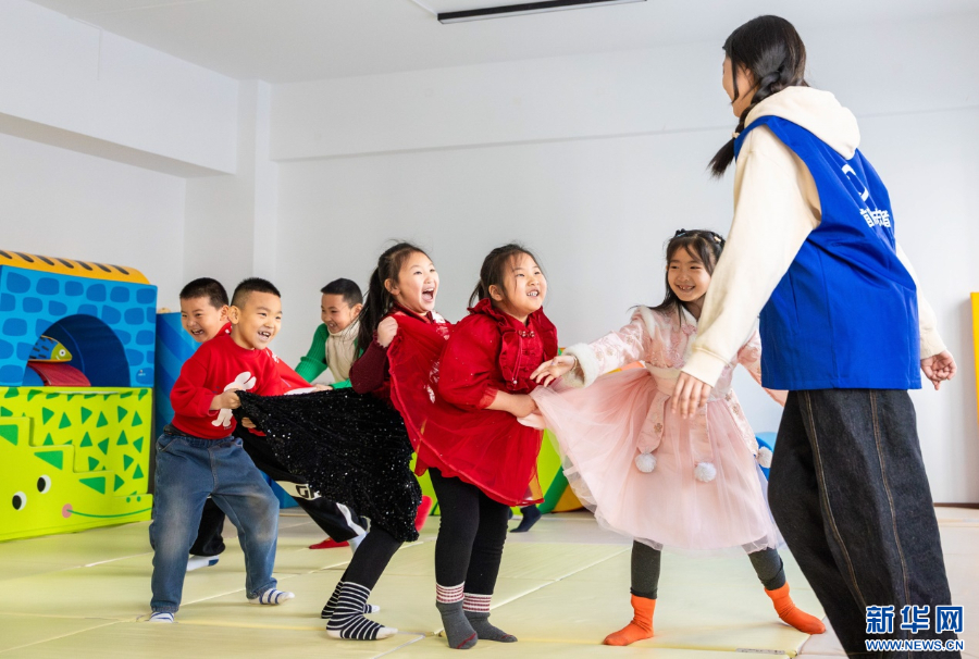 1月26日,在呼和浩特市玉泉区秋实社区,集中托管的学生在玩趣味游戏。新华网发(丁根厚 摄)
