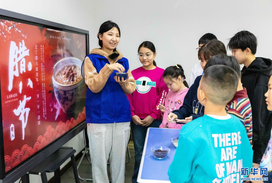 1月26日,在呼和浩特市玉泉区秋实社区,青年志愿者为集中托管的学生讲解腊八节民俗知识。新华网发(丁根厚 摄)