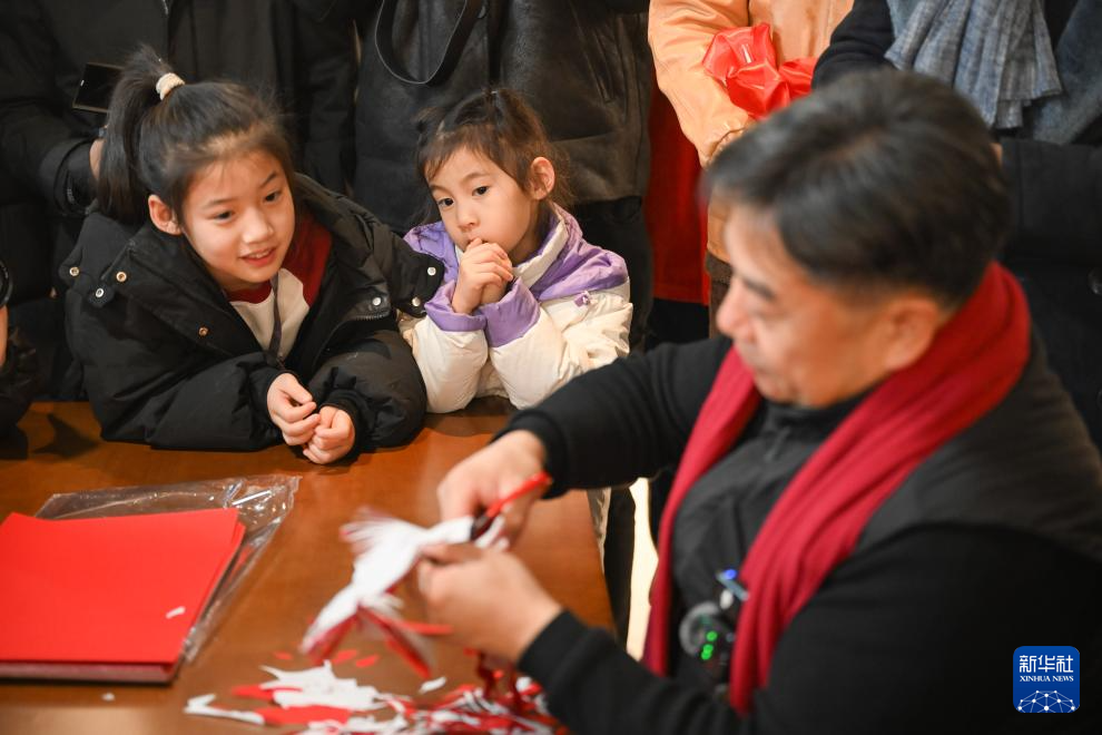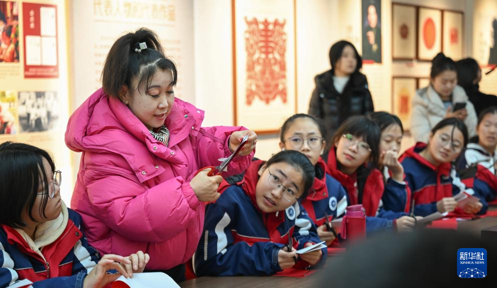 2月4日,学生们在内蒙古呼和浩特市和林格尔土城子国家考古遗址公园剪纸陈列馆交流剪纸技艺。新华社记者 贝赫 摄