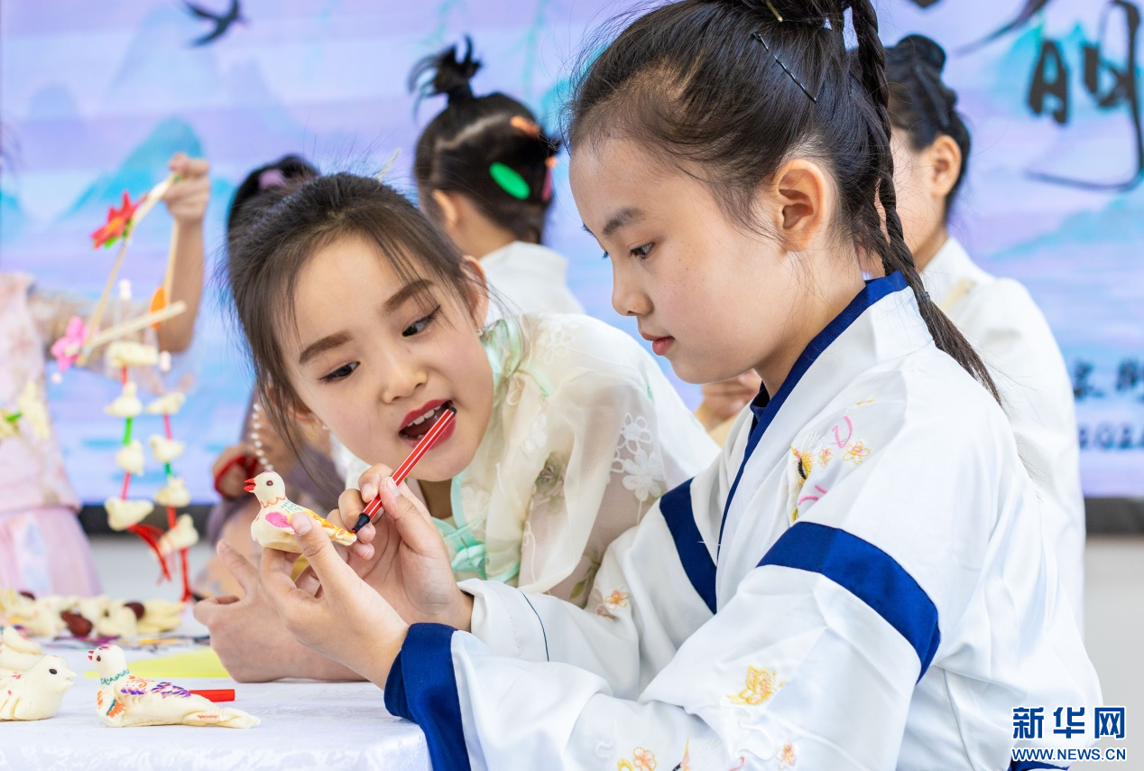 4月2日,在呼和浩特市玉泉区清泉街小学清明节主题活动现场,学生们在彩绘面塑“寒燕”。新华网发(丁根厚 摄)