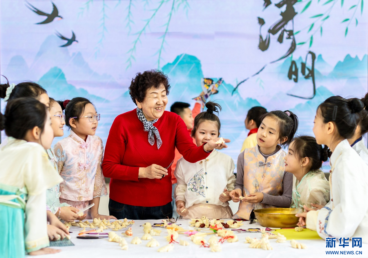 4月2日,在呼和浩特市玉泉区清泉街小学清明节主题活动现场,学生们在民间艺人指导下学习制作面塑“寒燕”。新华网发(丁根厚 摄)