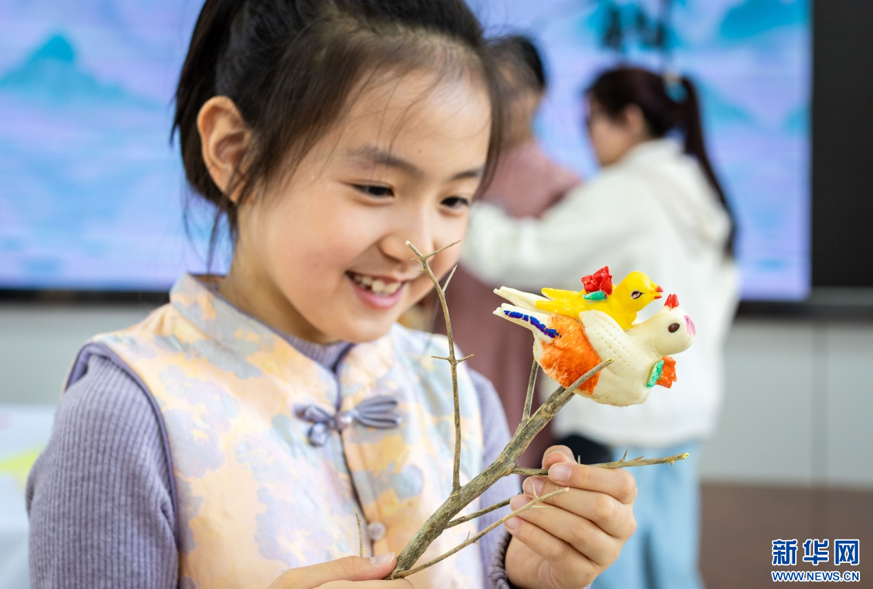 4月2日,在呼和浩特市玉泉区清泉街小学清明节主题活动现场,学生展示制作的“春燕护雏”面塑作品。新华网发(丁根厚 摄)
