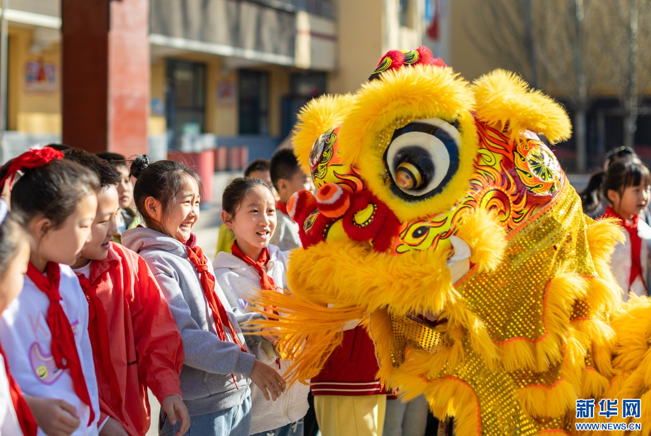 4月2日,在呼和浩特市玉泉区清泉街小学清明节主题活动现场,参与舞狮表演的学生与同学们互动。新华网发(丁根厚 摄)