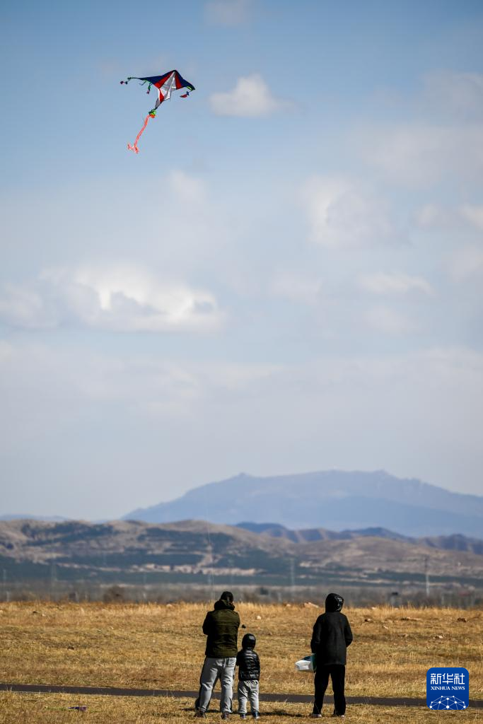 4月5日,人们在内蒙古呼和浩特敕勒川草原放风筝。新华社记者 连振 摄