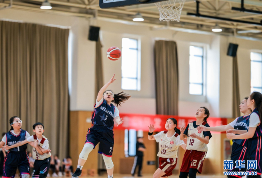 4月9日,内蒙古师范大学附属第三学校队球员在小学女子组比赛中投篮。新华网发(丁根厚 摄)