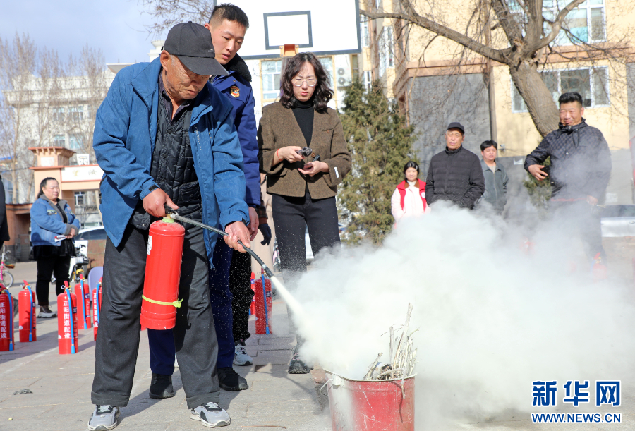 4月20日,在内蒙古自治区扎兰屯市正阳街道办事处红旗社区,消防队员指导社区居民正确使用消防灭火器材。新华网发(韩颖群 摄)