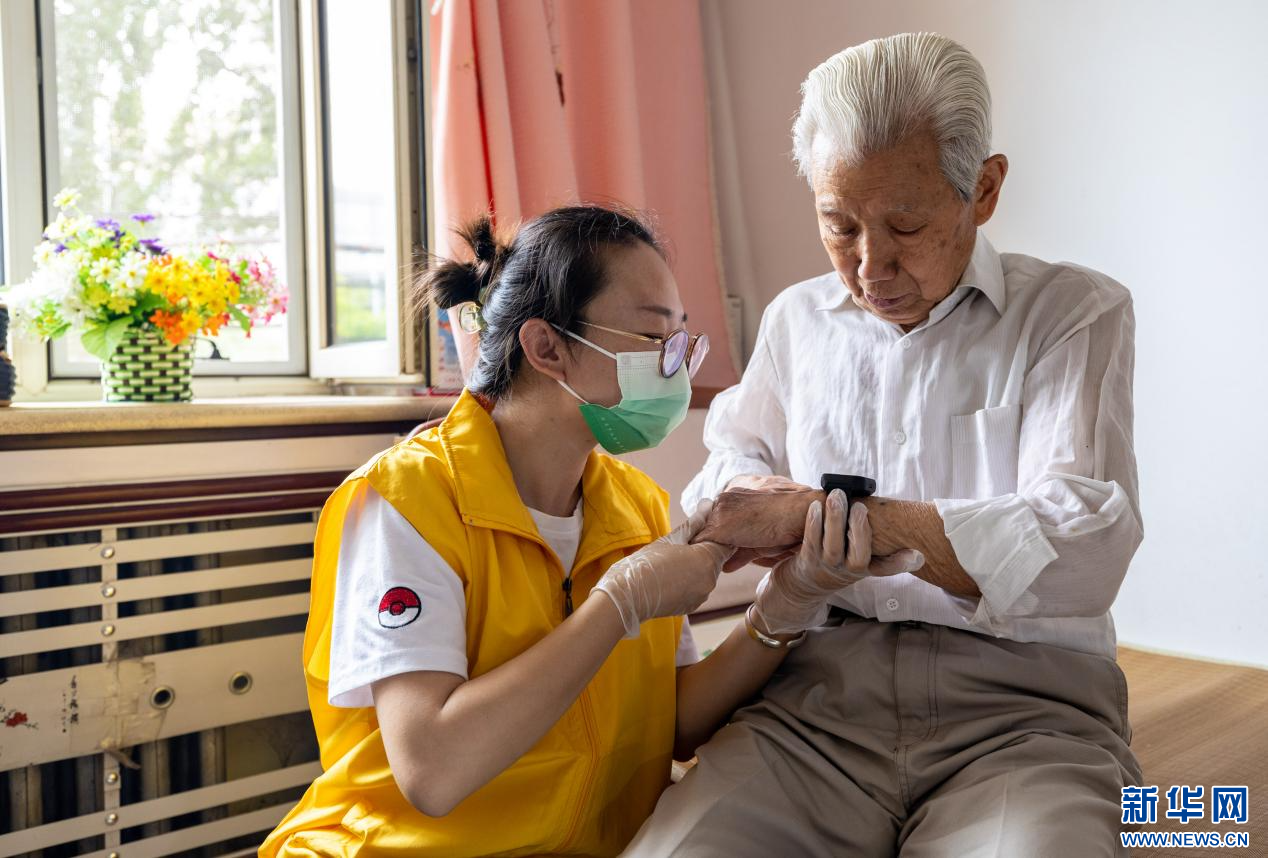 6月25日,护理员指导呼和浩特市玉泉区康乐社区低保户老人,使用适老化改造项目配备的智能手表。新华网发(丁根厚 摄)