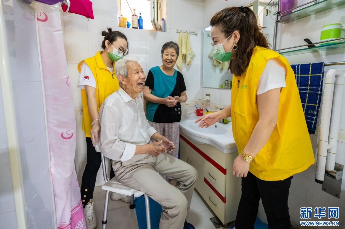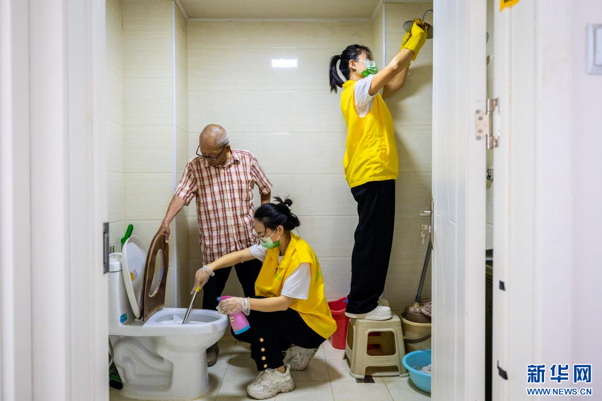 6月25日,护理员在呼和浩特市玉泉区四里营西社区空巢老人家里清洁卫生间。新华网发(丁根厚 摄)